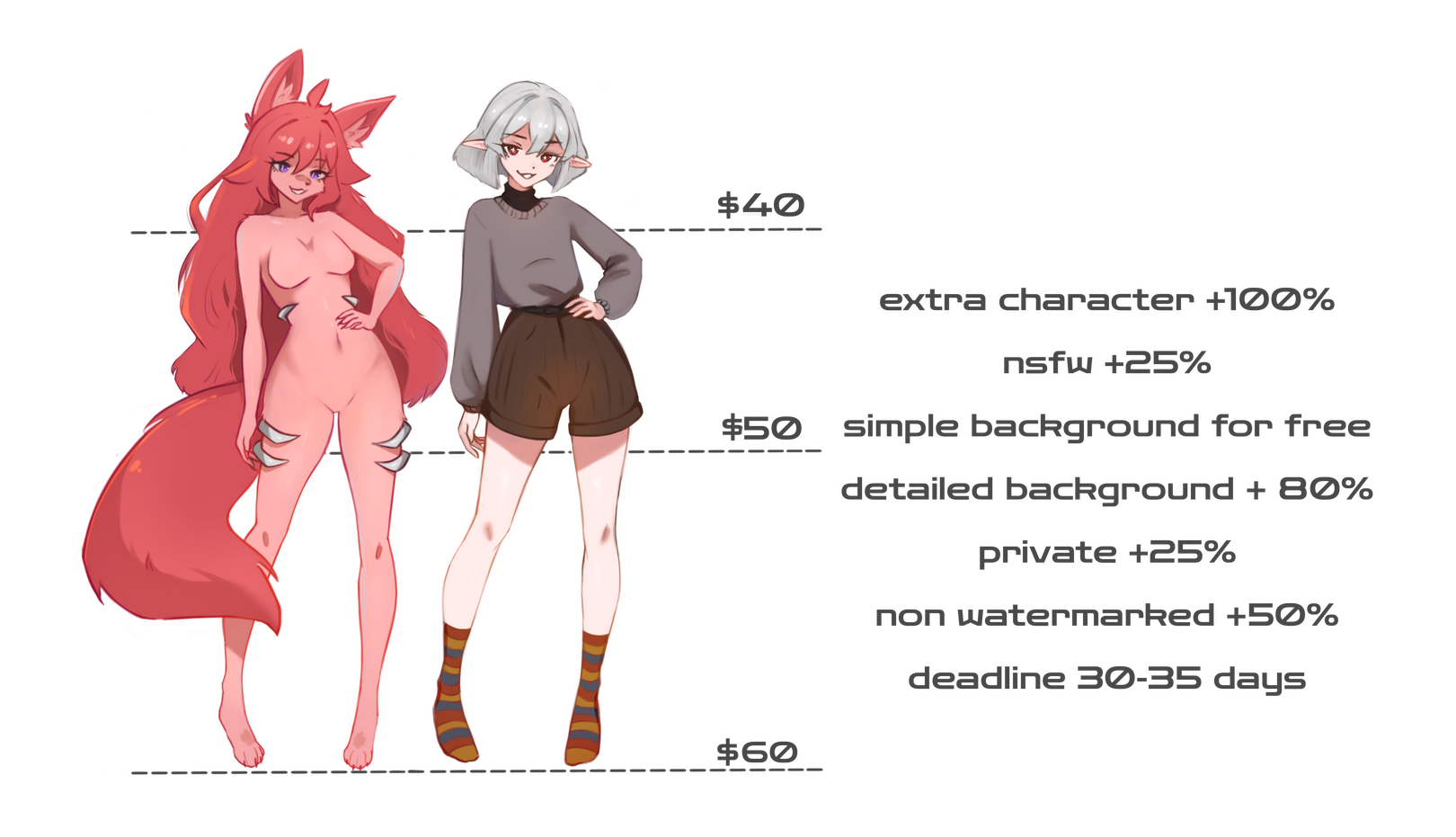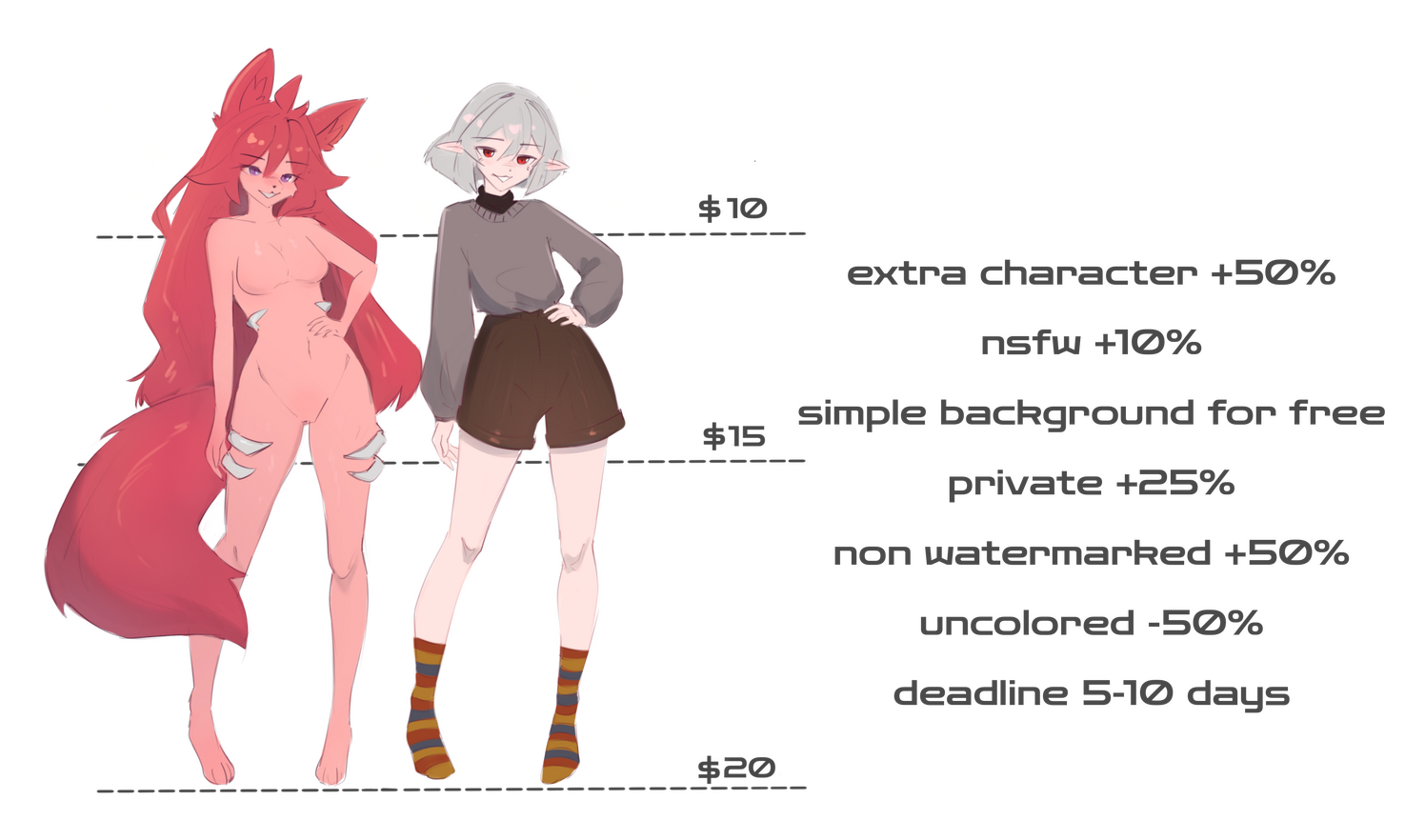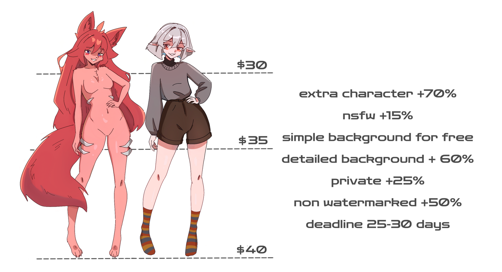 -I can share WIPs and done works on my social. If you don't want your commission to be posted anywhere, you can ask for a private commission (it will cost 25% extra of the final price)